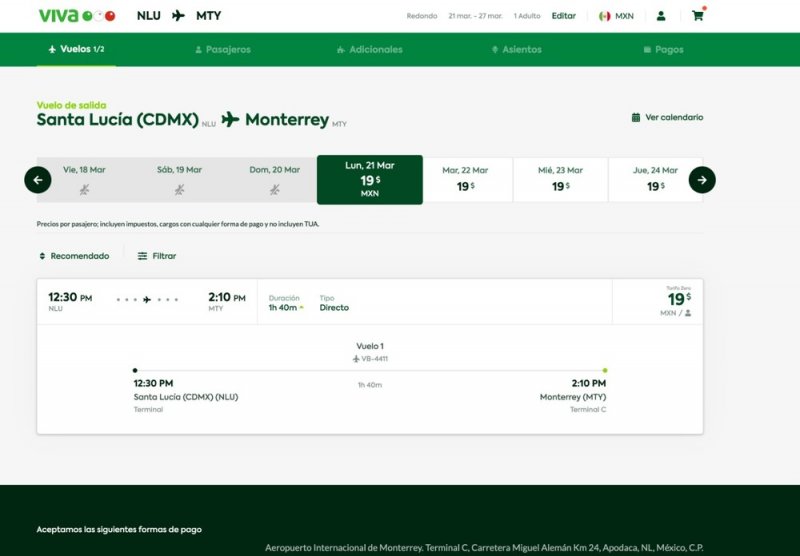 El vuelo con dirección a Monterrey, por otra parte, costará tan solo 19 pesos mas TUA desde el primer día de operaciones del Felipe Ángeles. El viaje a la capital neoleonesa está pactado para despegue a las 12:30 hrs. del día.