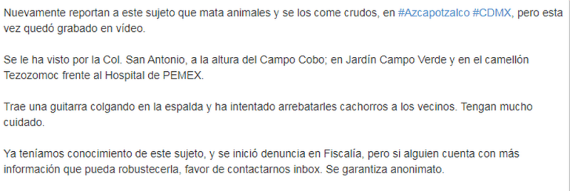 “Nuevamente reportan a este sujeto que mata animales y se los come crudos, en #Azcapotzalco #CDMX, pero esta vez quedó grabado en vídeo. Trae una guitarra colgando en la espalda y ha intentado arrebatarles cachorros a los vecinos. Tengan mucho cuidado”, se lee en la alerta emitida por Mundo Patitas.