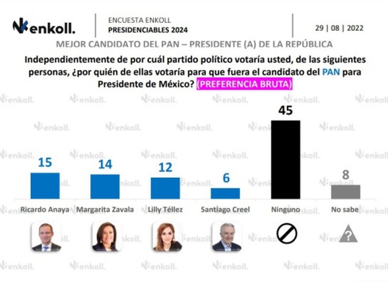 El Partido Acción Nacional, se distingue en la encuesta porque el 45% no votaría por ninguno de los preferidos de la derecha.