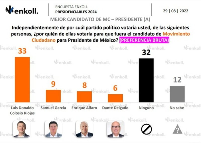Y en Movimiento Ciudadano, Luis Donaldo Coloso Riojas lidera la preferencia con 33% muy por encima de Samuel García con 9% y Enrique Alfaro con solo el 8%.