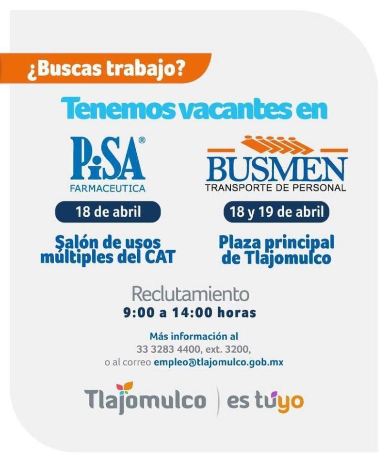 A través de sus cuentas oficiales de redes sociales, el Gobierno de Tlajomulco anunció la apertura de vacantes de empleos en algunas de las empresas más grandes instaladas en el municipio: Pisa Farmacéutica y Busmen, Transporte de Personal; ambas, buscando nuevos talentos para unirse a su equipo de trabajo.