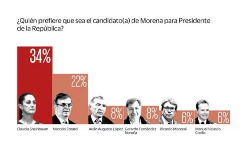 Claudia Sheinbaum lidera las preferencias en la pregunta de quién de los seis aspirantes debería ser la o el candidato de Morena y su coalición para la Presidencia de la República. Un 34% prefiere que Sheinbaum sea la candidata de Morena, mientras que 22% prefiere a Ebrard. Los demás aspirantes registran cifras entre 6% y 8%. Es importante destacar que dependiendo de las reglas de selección, esta pregunta podría ser decisiva en la definición de la candidatura de Morena.