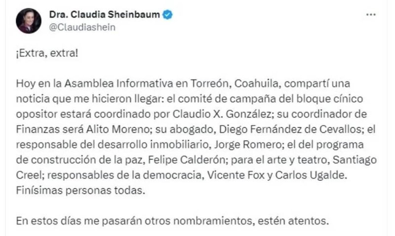 “Hoy en la Asamblea Informativa en Torreón, Coahuila, compartí una noticia que me hicieron llegar: el comité de campaña del bloque cínico opositor estará coordinado por Claudio X. González; su coordinador de Finanzas será Alito Moreno; su abogado, Diego Fernández de Cevallos; el responsable del desarrollo inmobiliario, Jorge Romero; el del programa de construcción de la paz, Felipe Calderón; para el arte y teatro, Santiago Creel; responsables de la democracia, Vicente Fox y Carlos Ugalde. Finísimas personas todas”, escribió Claudia.