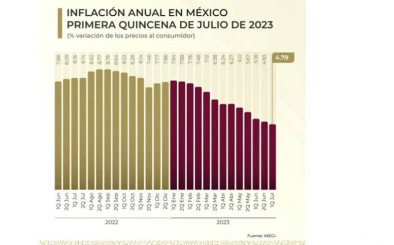 El primer mandatario se refirió al reporte del Inegi en el que señala que en la primera quincena de julio de 2023, el Índice Nacional de Precios al Consumidor (INPC) registró una variación de 0.29 por ciento respecto a la quincena anterior, con lo que la inflación general anual se ubica en 4.79 por ciento, con ello la inflación suma su quinta quincena a la baja.