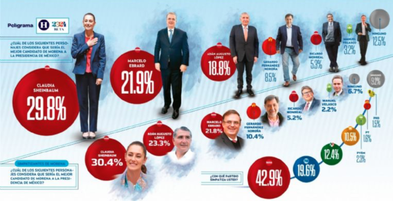 De acuerdo con una reciente encuesta realizada por el periódico El Heraldo de México/Poligrama, Claudia Sheinbaum Pardo es la favorita para llegar a la Presidencia en 2024 dentro del partido Morena y sus aliados PT y PVEM.