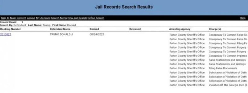 El expresidente de los Estados Unidos, Donald Trump, ya aparece en los registros de la cárcel del condado de Fulton, donde se enumeran los cargos en su contra y por los que deberá comparecer, de acuerdo con información de ABC News.