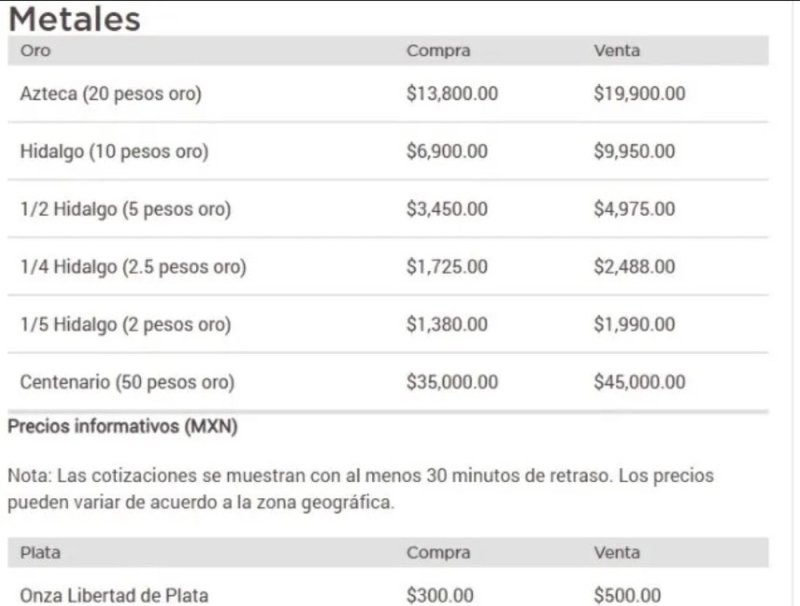 Por su parte, la institución financiera mexicana compra a 6 mil 900 pesos el Hidalgo (moneda de 10 pesos oro); a 3 mil 450 pesos el 1/2 Hidalgo; a mil 725 pesos el 1/4 de Hidalgo; a mil 380 pesos el 1/5 Hidalgo, y a 35 mil pesos el Centenario (50 pesos oro). Asimismo, la Onza Libertad de Plata tiene un precio de compra de 300 pesos.