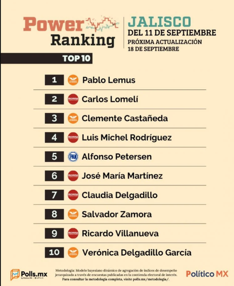 El Power Ranking de Jalisco de Polls MX, presentado semanalmente, NO es una encuesta. Es un modelo que jerarquiza la fuerza política de los aspirantes a la Jefatura de Gobierno en las elecciones 2024 tomando en cuenta careos públicos e hipotéticos entre rivales de diferentes partidos, así como la relevancia mediática y conversacional de las casas encuestadoras. La próxima actualización del Power Ranking de Jalisco se publicará el 18 de septiembre de 2023.