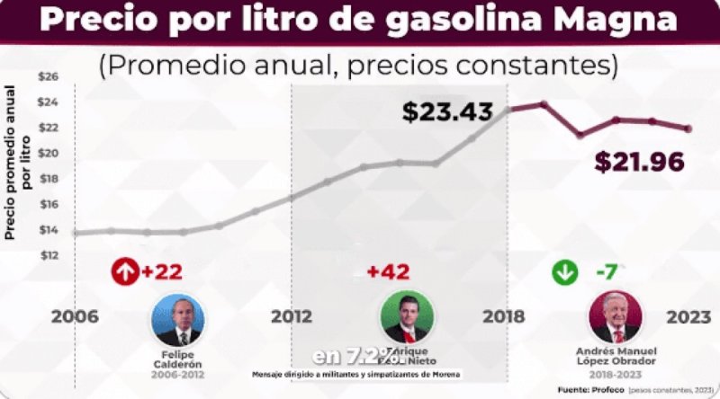 A través de un video publicado en redes sociales, la coordinadora nacional de la Defensa de la Transformación expuso que el precio de la gasolina tuvo un aumento real del 22.9 por ciento con Felipe Calderón y del 42.8 por ciento con Peña Nieto, mientras que, con la llegada de la Cuarta Transformación hubo una disminución del 7.2 por ciento en los precios.