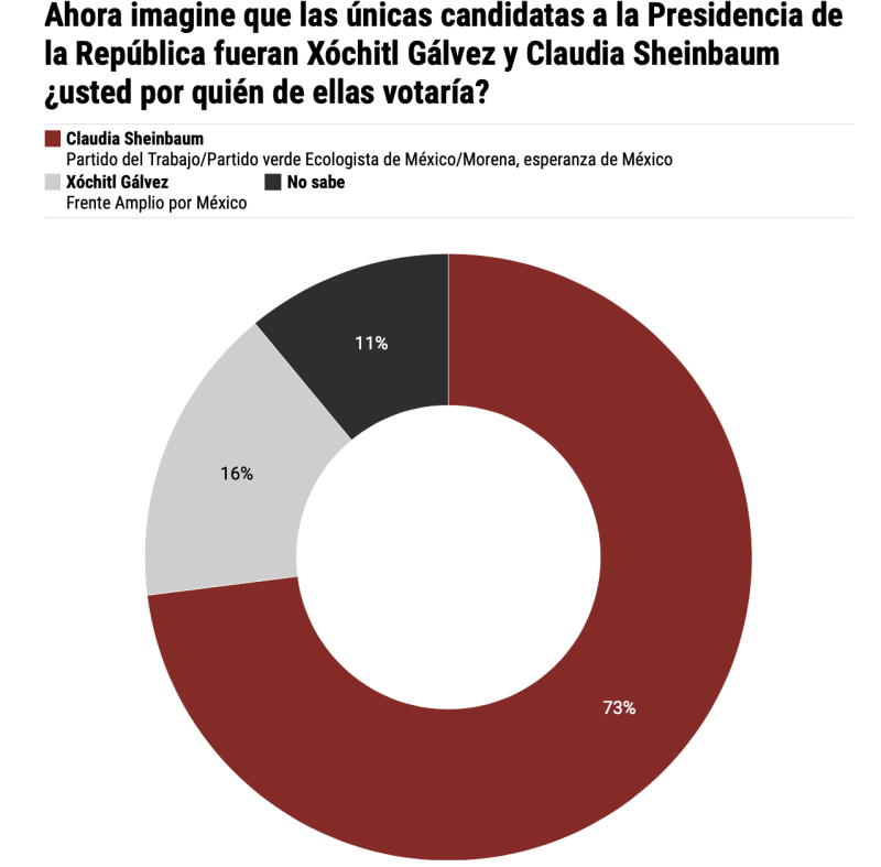 Covarrubias y Asociados presenta también dos escenarios entre los candidatos a la presidencia. En el primero están Claudia Sheinbaum, Xóchitl Gálvez y Samuel García. El resultado de la abanderada de Morena es de un 64% de las preferencias, mientras que Gálvez obtiene un 17% de los votos y Samuel García un pobre 6%. En un segundo escenario, enfrenta a Sheinbaum con Gálvez, y ahí la ventaja de la morenista se incrementa notablemente, al obtener un 73% de la intención de voto, mientras que su rival del Frente Amplio se queda con un 16%.