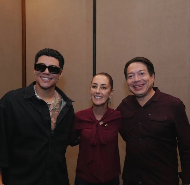 La canción "Ya Supérame" resonó en el escenario, con Claudia Sheinbaum, la Gobernadora de Baja California, Marina del Pilar Ávila, y el líder nacional de Morena, Mario Delgado, compartiendo el momento musical con el carismático miembro de Grupo Firme.
