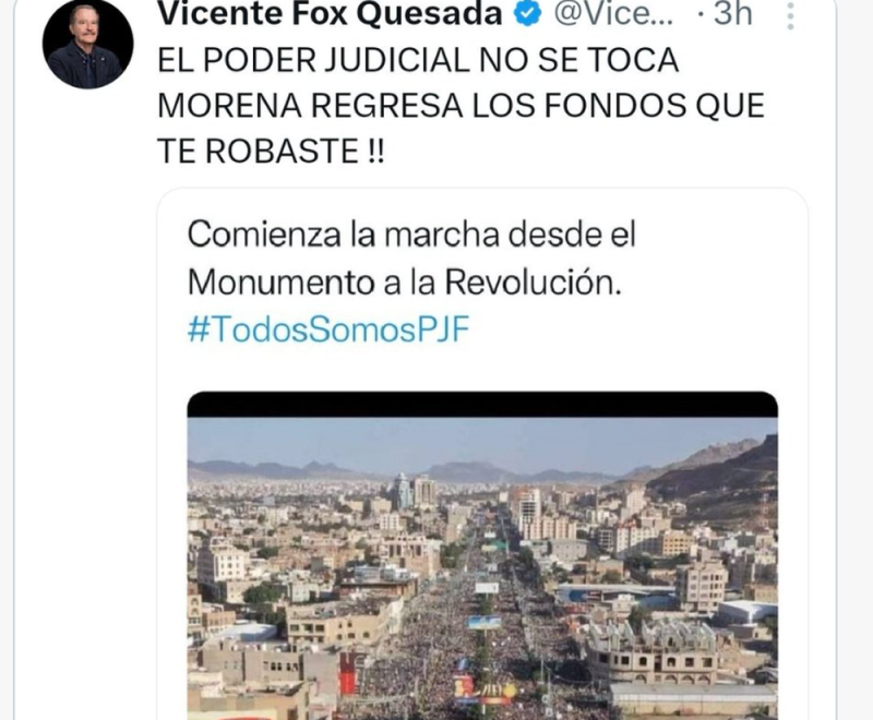 AMLO compartió la captura de pantalla donde Vicente Fox comparte una fotografía que no corresponde con la marcha que trabajadores del Poder Judicial de la Federación realizaron.