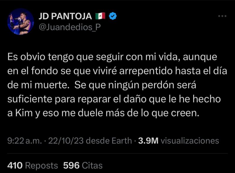 “Es obvio tengo que seguir con mi vida, aunque en el fondo sé que viviré arrepentido hasta el día de mi muerte. Sé que ningún perdón será suficiente para reparar el daño que le he hecho a Kim y eso me duele más de lo que creen.” Dijo en su cuenta de X.