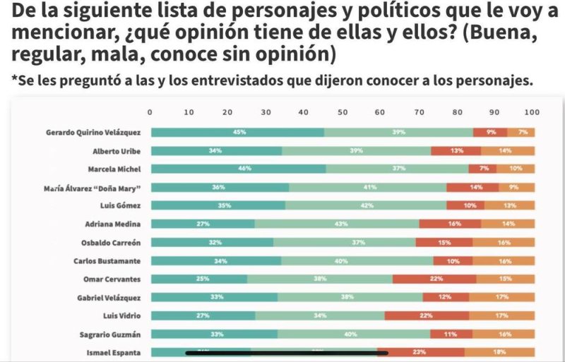 En un segundo bloque de personalidades conocidas en el municipio, destacan la coordinadora Adriana Medina (21 por ciento), el Síndico Osbaldo Carreón (18 por ciento), y el Regidor Juan Carlos Bustamante (17.5 por ciento), entre otros.