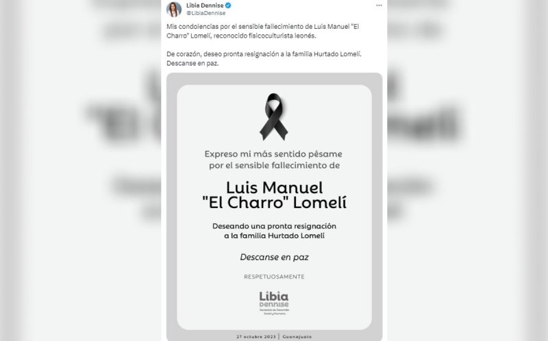 “Mis condolencias por el sensible fallecimiento de Luis Manuel "El Charro" Lomelí, reconocido fisicoculturista leonés. De corazón, deseo pronta resignación a la familia Hurtado Lomelí. Descanse en paz”, público en su cuenta de X, antes Twitter.
