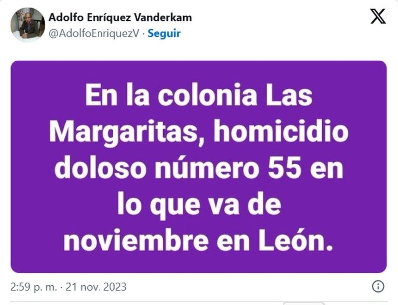 Horas antes de la muerte del activista, Adolfo Enríquez Vanderkam denunció en sus redes sociales que hasta la tarde del 21 de noviembre se registraban 55 homicidios dolosos a manos del crimen organizado en León, su última publicación.