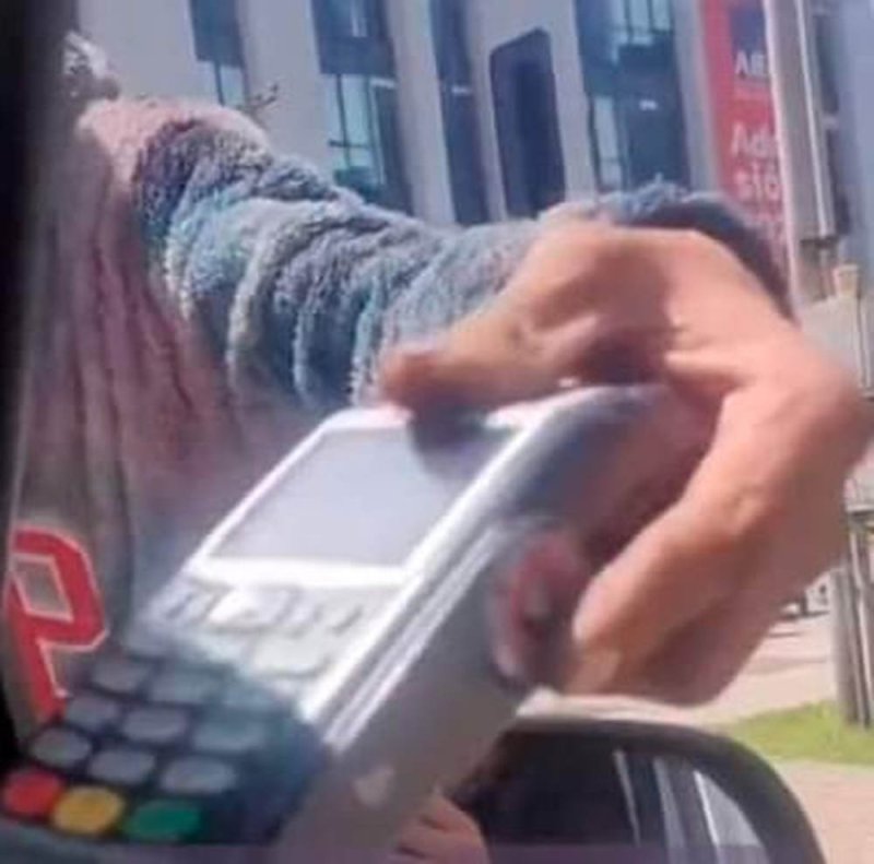 El inusual acontecimiento fue capturado en un video compartido a través de la cuenta de TikTok (tiktok_univers2024), donde se observa al trabajador limpiando el cristal delantero de un automóvil mientras saca una terminal de su bolsillo y la coloca frente al copiloto.