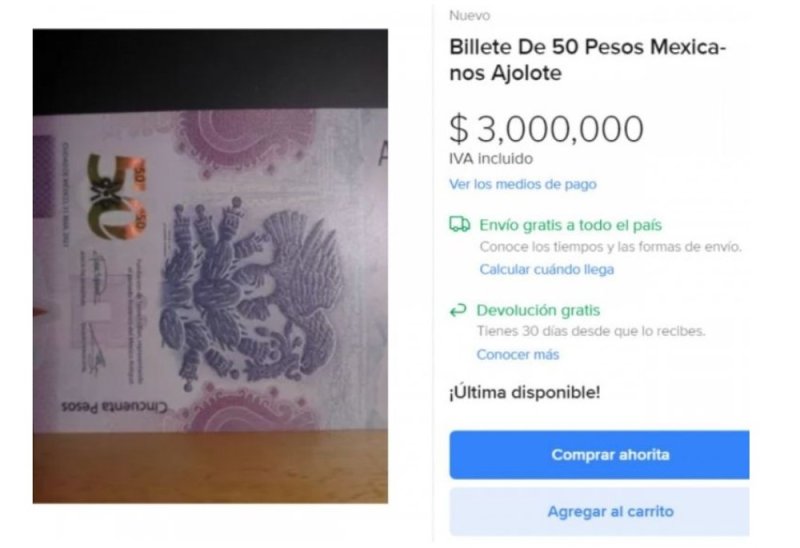 Se trata del billete de 50 pesos con la imagen de un ajolote, el cual empezó a circular de manera oficial desde octubre de 2021, mismo que forma parte de la familia G; ahora ha circulado información sobre la venta de uno de estos ejemplares a través de Internet, el cual eleva su costo a los tres millones de pesos por poseer características “únicas” o muy difíciles de encontrar.