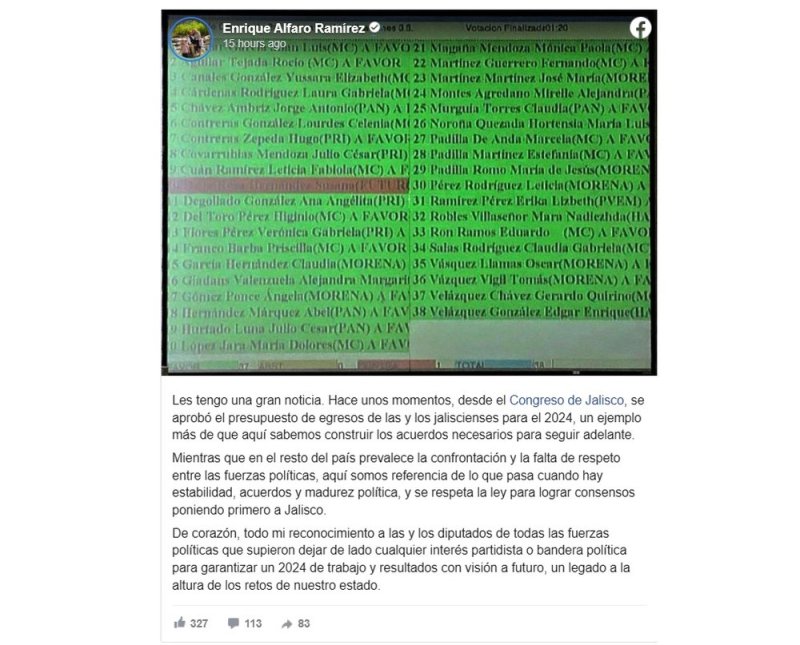 El Gobernador del Estado, Enrique Alfaro Ramírez, celebró este miércoles la aprobación del Presupuesto de Egresos 2024 en manos del Congreso de Jalisco, avalado por 6 de los 7 grupos parlamentarios: MC, Morena, PAN, Hagamos, PRI y PV, siendo un ejemplo más la entidad en una difícil coyuntura como la que vive Nuevo León y Ciudad de México, donde en lo local prevalece el respeto, estabilidad y madurez política señaló el mandatario.