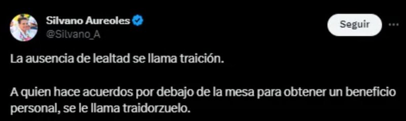 Debido a que sus palabras hicieron eco, el exgobernador michoacano utilizó su cuenta oficial de X, antes Twitter, para sentenciar lo que entiende por traición: “La ausencia de lealtad se llama traición. A quien hace acuerdos por debajo de la mesa para obtener un beneficio personal, se le llama traidorzuelo”.