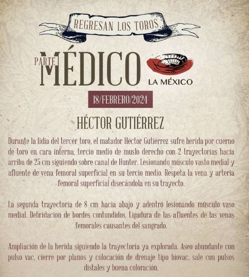 “Durante la lidia del tercer toro, el matador Héctor Gutiérrez sufre herida por cuerno de toro en cara interna, tercio medio de muslo derecho con 2 trayectorias hacia arriba de 25 cm siguiendo sobre canal de Hunter. Lesionando músculo vasto medial y afluente de vena femoral superficial en su tercio medio. Respeta la vena y arteria femoral superficial disecándola en su trayecto.