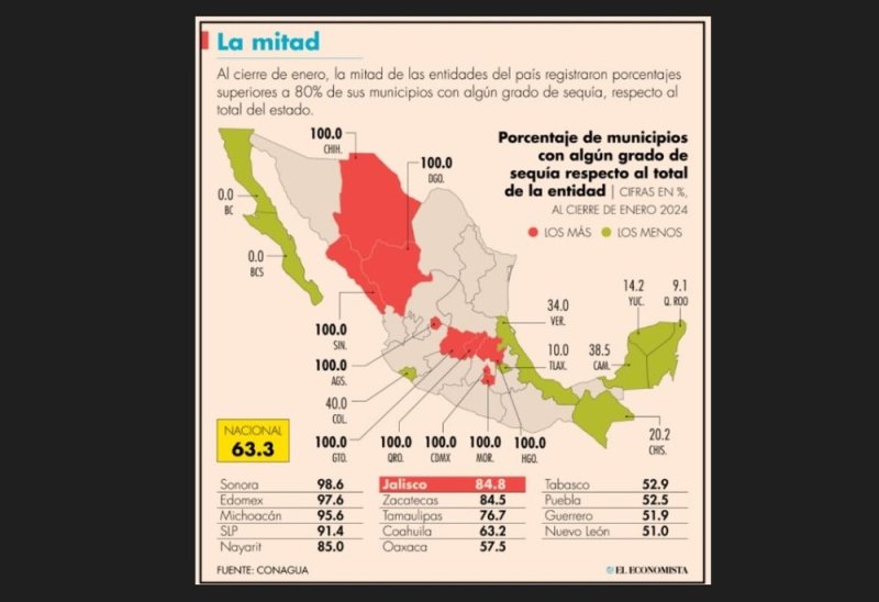De acuerdo con información de la Comisión Nacional del Agua (Conagua) al 31 de enero de este 2024, 84.8% de los municipios de Jalisco ya enfrentan alguna condición de sequía entre moderada, severa y extrema, y, de acuerdo con los pronósticos de académicos de la Universidad de Guadalajara (UdeG), la situación podría agravarse en el segundo semestre del año por el fenómeno de la Niña.