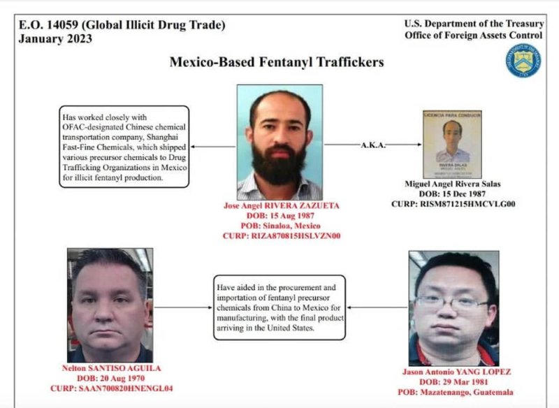 En enero de 2023 la Oficina de Control de Activos Extranjeros del Departamento del Tesoro de Estados Unidos sancionó a Yang López por ayudar en la adquisición e importación hacia México de precursores químicos que se emplean en la fabricación de fentanilo, cuyo producto final llega a territorio estadounidense.