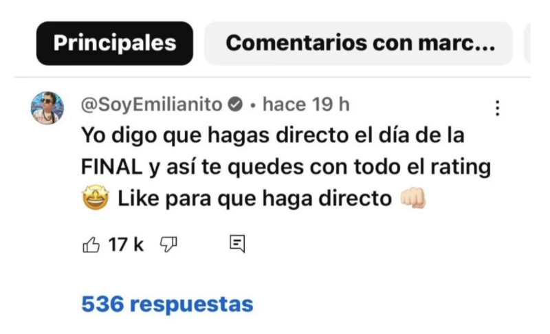"Yo digo que hagas directo el día de la final y así te quedes con todo el rating", comentó Emiliano en el último video del exconductor de SNSerio. Además, el seguidor de Marcelo agregó: "Like para que haga directo".