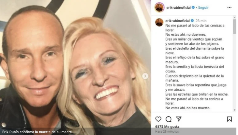 Erik usó su cuenta de Instagram para hacer una publicación con algunas fotografías de la mujer que le dio la vida y así anunció el fallecimiento: "No me pararé al lado de tus cenizas a llorar. No estás ahí, no duermes. Eres un millar de vientos que soplan y sostienen las alas de los pájaros. Eres el destello del diamante sobre la nieve. Eres el reflejo de la luz sobre el grano maduro. Eres la semilla y la lluvia benévola del otoño. Cuando despierto en la quietud de la mañana, eres la suave brisa repentina que juega y me abraza".
