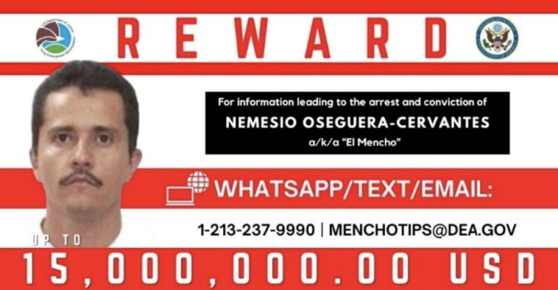 Hasta la fecha, la Administración de Control de Drogas (DEA, por sus siglas en inglés) mantiene una recompensa de 15 millones de dólares para la persona que pueda brindar información que ayude a la captura de "El Mencho". La agencia agrega que Oseguera es buscado por delitos relacionados al tráfico de drogas y que actualmente es el líder de la organización criminal CJNG, por lo que exhorta a las personas a denunciarlo de forma anónima a través del correo: menchotips@dea.gov.