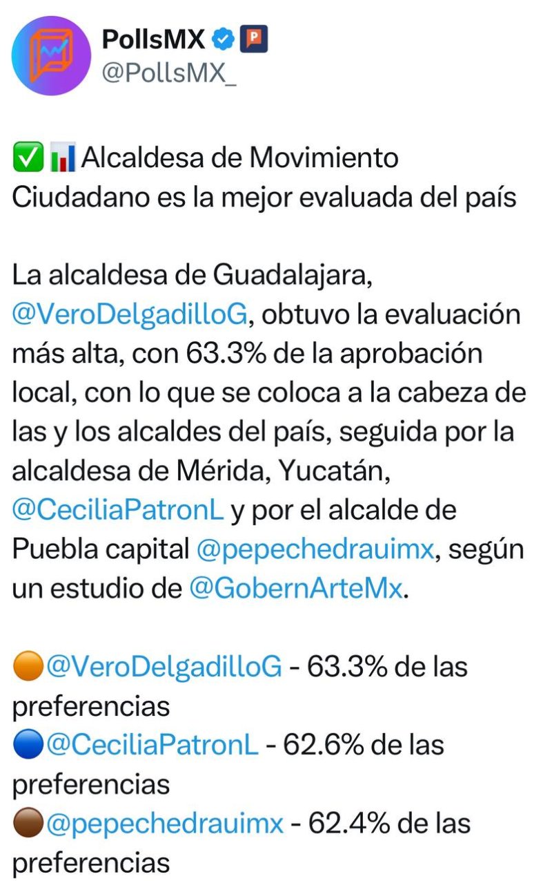 Con un 63.3% de aprobación local, Delgadillo, primera mujer alcaldesa de la capital de Jalisco lidera la lista de autoridades municipales con mayor respaldo ciudadano, a 5 meses de haber iniciado su gestión.