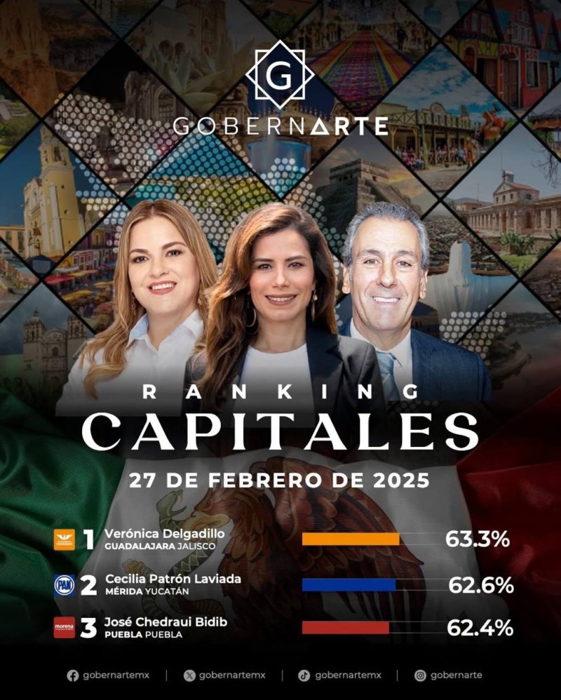 Ciudad de México; 03 de marzo de 2025. En un estudio presentado el 27 de febrero pasado a través del cual se dio a conocer el ranking de los alcaldes y alcaldesas de las capitales del país mejor evaluados por parte de la consultora GobernArte, Verónica Delgadillo, alcaldesa de Guadalajara por el partido Movimiento Ciudadano, se colocó en el primer lugar como la alcaldesa mejor evaluada.