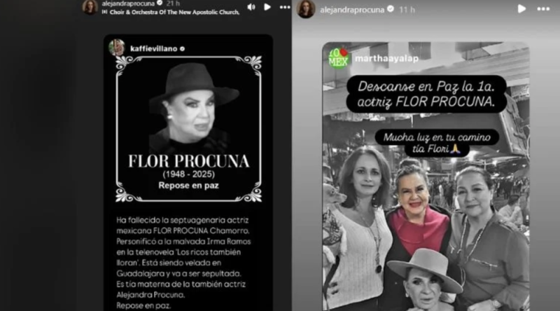 Por ejemplo, Ale compartió en sus historias de Instagram el mensaje que escribió el periodista Álex Kaffie para anunciar el fallecimiento de doña Flor. Asimismo, Procuna compartió la historia de una familiar que también lamentó la muerte de la primera actriz: "Mucha luz en tu camino, tía Flori".