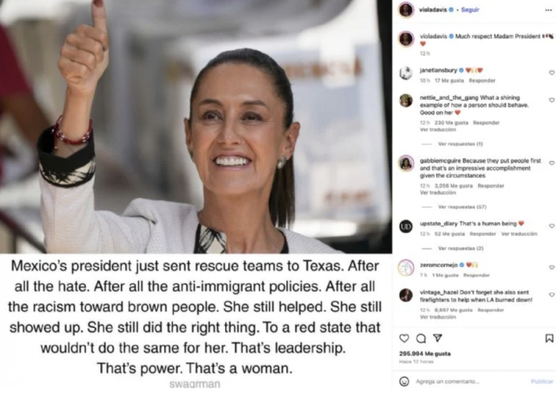 Viola Davis, conocida intérprete hollywoodense ganadora del Oscar como Mejor actriz de reparto por Fences, publicó en su cuenta de Instagram un agradecimiento a la mandataria mexicana y destacó la acción pese a las recientes políticas antiinmigrantes del gobierno de Donald Trump, secundadas por el gobernador de Texas, Greg Abbot.