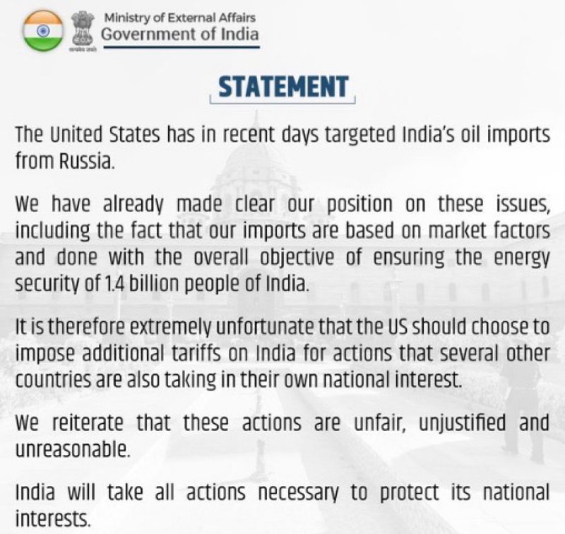 “Es extremadamente desafortunado que Estados Unidos elija imponer aranceles adicionales a India por acciones que muchos otros países también están llevando a cabo en su propio interés nacional. Reiteramos que estas acciones son injustas, injustificadas e irracionales”.