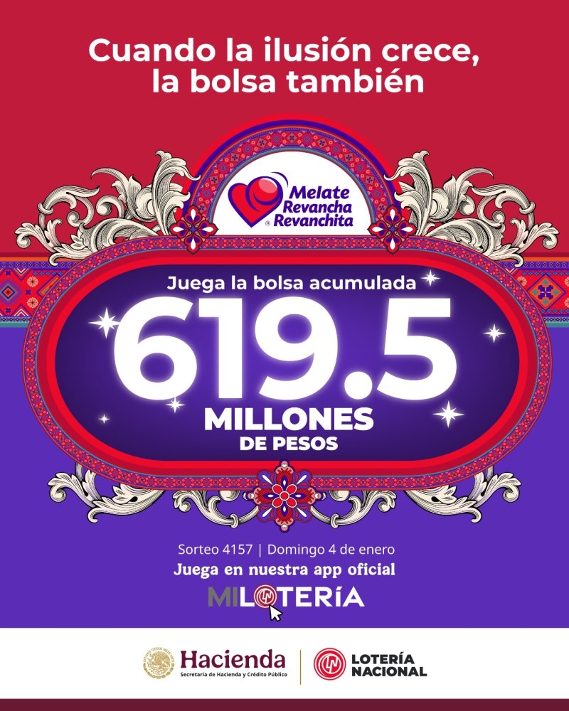 Ciudad de México, 3 de enero de 2026.— La Lotería Nacional informó que el próximo sorteo Melate, Revancha y Revanchita No. 4157 contará con una bolsa acumulada de 619.5 millones de pesos, una de las más altas en la historia de estos sorteos electrónicos y que se ubica dentro del top 10 de las bolsas históricas acumuladas.