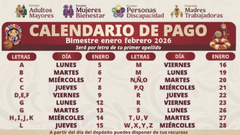 La dispersión del recurso se realiza conforme a un calendario alfabético, basado en la primera letra del apellido de cada persona beneficiaria. Este esquema busca evitar concentraciones en sucursales y cajeros del Banco del Bienestar durante los días de mayor demanda.