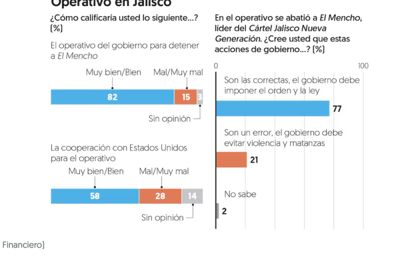 Según los resultados de una encuesta reciente, un porcentaje significativo de los encuestados calificó de manera positiva las acciones emprendidas por las autoridades en este operativo, destacando la labor del Ejército y de García Harfuch en la estrategia de seguridad. La aprobación indica que gran parte de la ciudadanía valora la actuación de las fuerzas de seguridad ante uno de los capos más buscados y peligrosos del país.