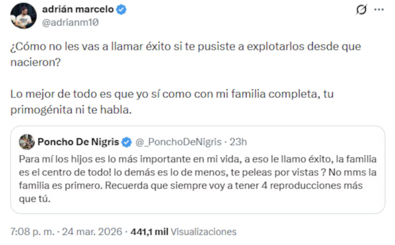 Sus palabras en la red social generaron un intenso debate entre los internautas, pero también la reacción de Adrián Marcelo, quien aseguró que durante su trayectoria se ha dedicado a monetizar con sus hijos, menos con su primogénita.