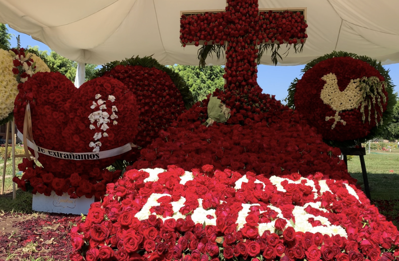 De entre los adornos sobresale la frase “Te amo bebé”, un atril de madera sostiene una corona con un gallo de cuerpo y patas hecho con rosas blancas que resalta de un fondo de rosas rojas.