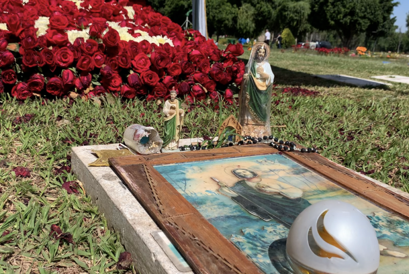 En el césped hay cientos de pétalos entre frescos y marchitos en tonalidad rojiza, sobre una lápida vecina a la que en vida lidero uno de los cárteles más sanguinarios de México, un cuadro con la imagen de San Judas Tadeo, dos figurad de yeso del mismo santo, un rosario, una veladora y una pequeña caja con la Virgen de San Juan de los Lagos, que los visitantes han ido dejado.