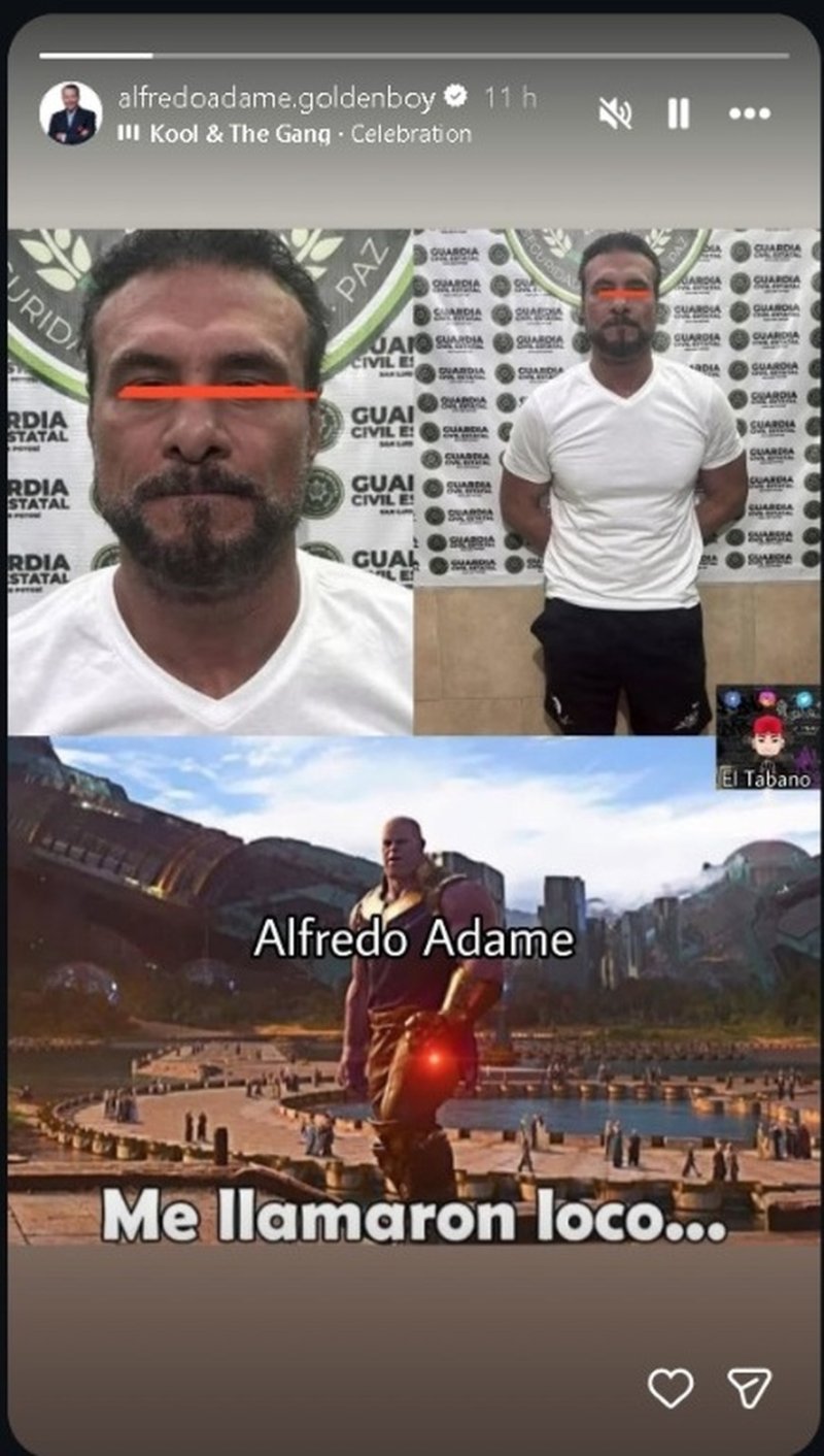 En su cuenta de Instagram, el actor compartió imágenes del momento de la detención de “El Patrón”, acompañadas de una referencia al personaje Thanos, del universo Marvel. En la publicación, Adame dejó ver que, a su consideración, las acusaciones que hizo en el pasado tenían fundamento.
