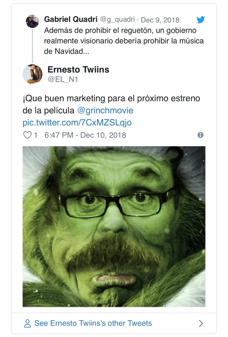 La súbita declaración, carente de argumentos, despertó las burlas de los usuarios de la red social, quienes lo compararon con Ebenezer Scrooge, el amargado protagonista del ‘Cuento de Navidad’ de Charles Dickens y el ‘Grinch’, la asocial criatura verde que cultiva su odio contra el prójimo, especialmente en épocas navideñas.