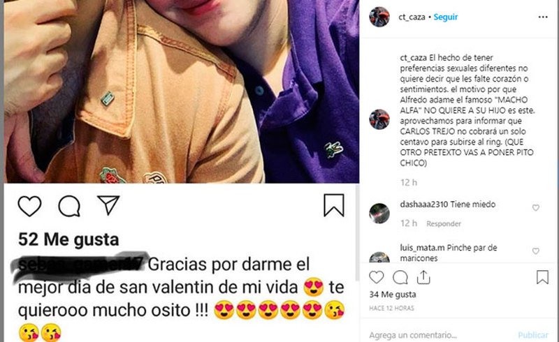 Este jueves, Carlos Trejo publicó en su cuenta de Instagram una captura de pantalla en la que intenta demostrar que Sebastián Adame es homosexual, pues en la imagen el joven aparece cariñoso con otro hombre al que le escribió: ‘gracias por darme el mejor día de San Valentín de mi vida, te quiero mucho osito’.