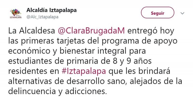 La alcaldesa de Iztapalapa, Clara Brugada Molina, inició la entrega de ocho mil tarjetas a alumnos de escuelas públicas primarias de 8 y 9 años. Los menores recibirán 500 pesos de manera bimestral como ayuda, para apoyarlos en sus estudios.