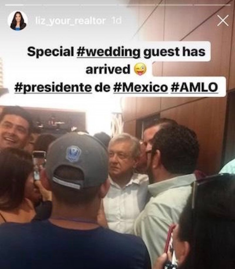 La propia novia compartió en su cuenta de Instagram una imagen donde se le ve junto a su ahora esposo y al mandatario, con la leyenda “¡Como cuando el presidente de México llega a tu boda”.
