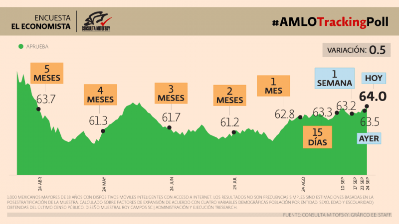 El presidente Andrés Manuel López Obrador subió su nivel de aprobación entre los mexicanos a 64%, después de su primer informe de gobierno, reveló la casa encuestadora Mitofsky. Este porcentaje representa un aumento de tres puntos respecto a la medición anterior, realizada en mayo de este año cuando la popularidad del mandatario se posicionó en 61.3%.