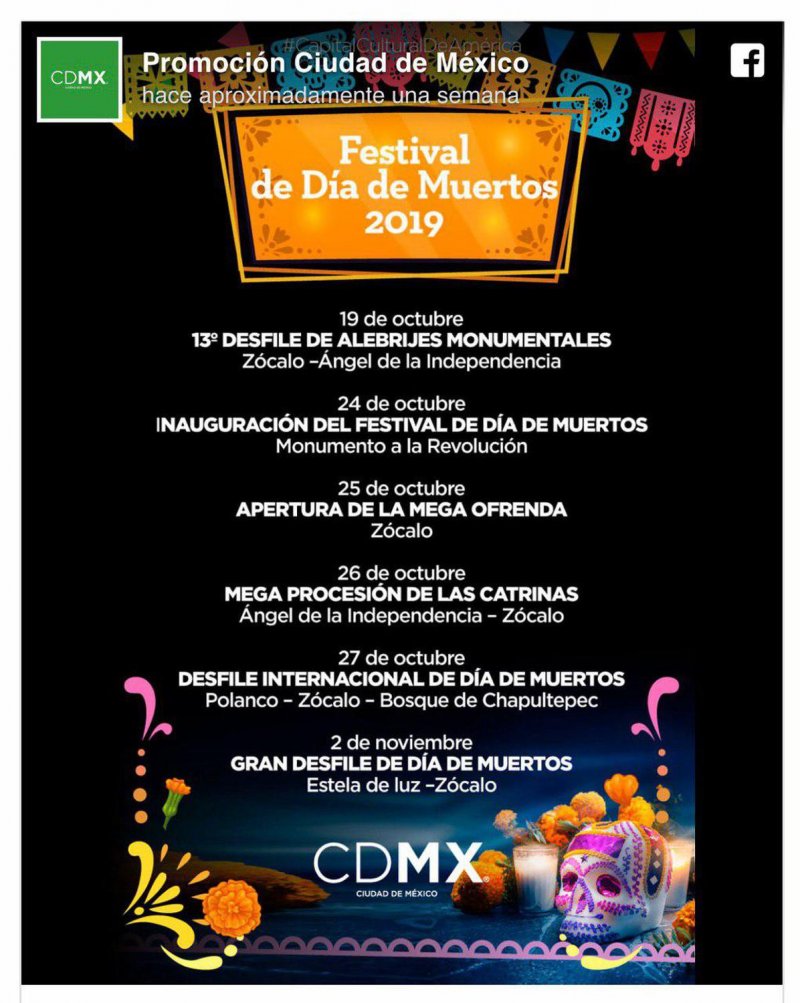 Por lo pronto, el Paseo de la Reforma ya cuenta con 270 mil flores de cempasúchil que le dan un colorido muy especial y lo hacen un espectáculo en sí mismo. El programa del Festival del Día de Muertos arrancará este 19 de octubre con una edición más del Desfile de Alebrijes.