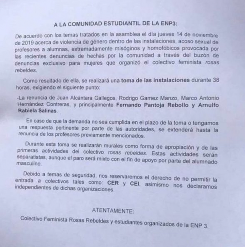 Las manifestantes exigen la renuncia de cinco profesores varones, a quienes acusan de violencia de género y acoso sexual, y aunque por el momento sólo permiten la salida de autos de profesores y trabajadores administrativos, no descartan el cierre de Eduardo Molina y San Juan de Aragón..
