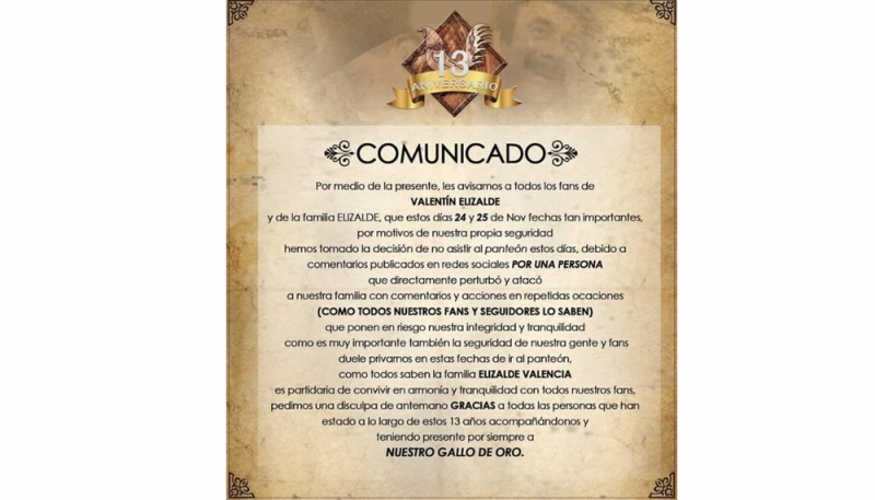 En un comunicado, a 13 años del asesinato del “Gallo de Oro”, la familia Elizalde indicó que una persona los ha amenazado en redes sociales por lo que por un tema de seguridad decidieron no visitar la tumba de Valentín.